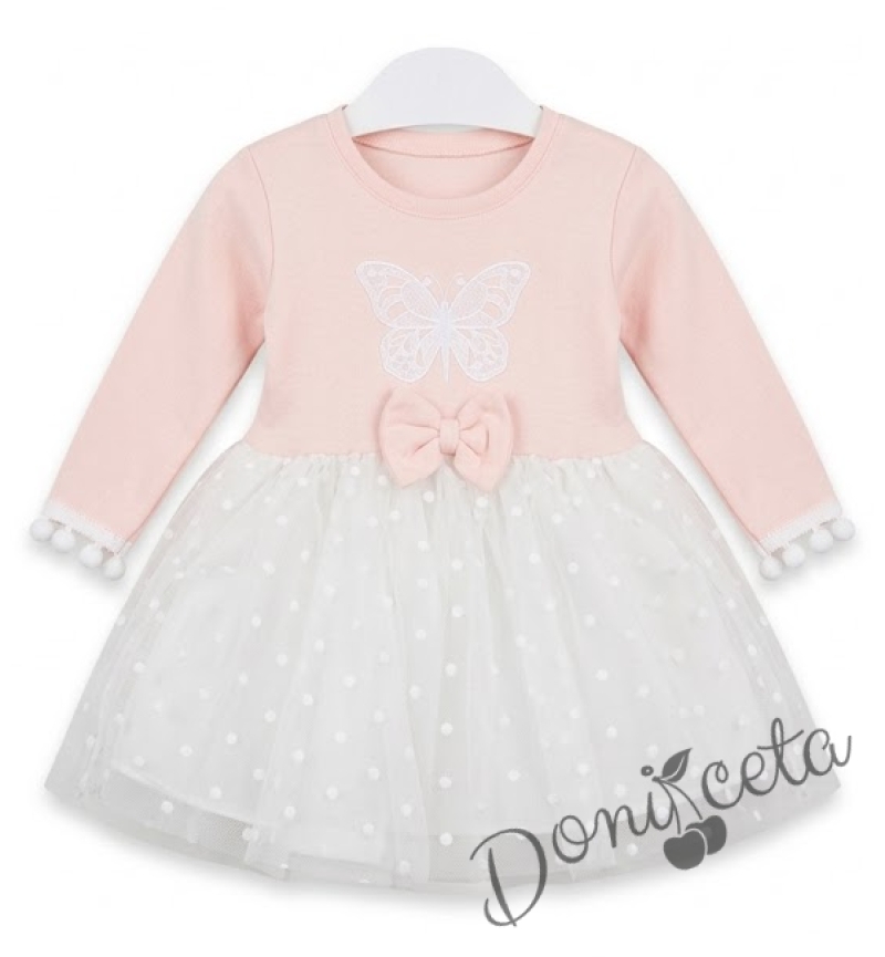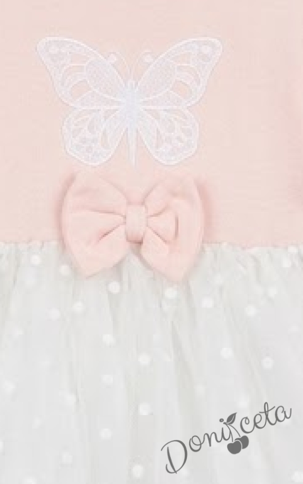 Бебешка ежедневна рокля с дълъг ръкав в прасковено с пеперуда и тюл