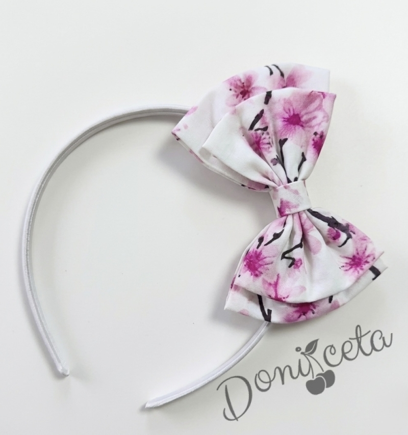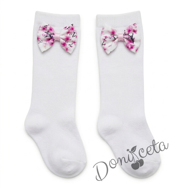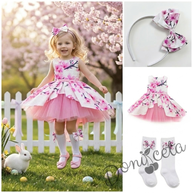 Комплект от детска официална памучна рокля с цветя в розово с тюл и колан Надежда с чорапи и диадема