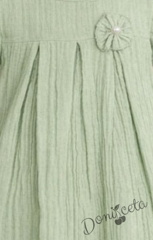 Детска ежедневна рокля с къс ръкав в нежен зелен цвят от памучен муселин
