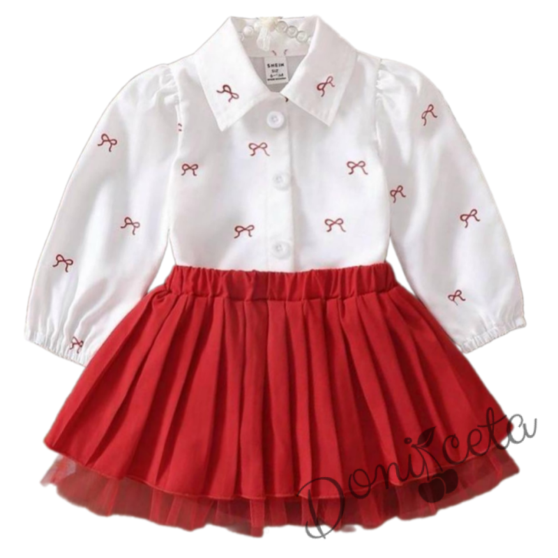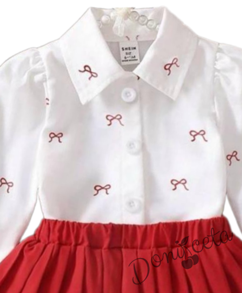 Комплект за момиче от риза в бяло с червени панделки и плисирана пола в червено Габи