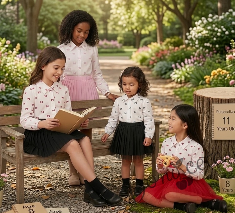 - Комплект от риза в бяло с черни панделки и плисирана пола в черно.