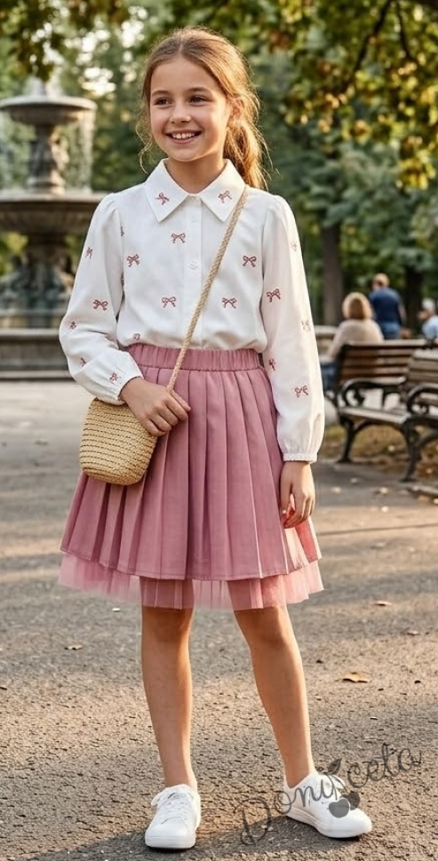 - Комплект от риза в бяло с панделки и плисирана пола в пепел от рози.