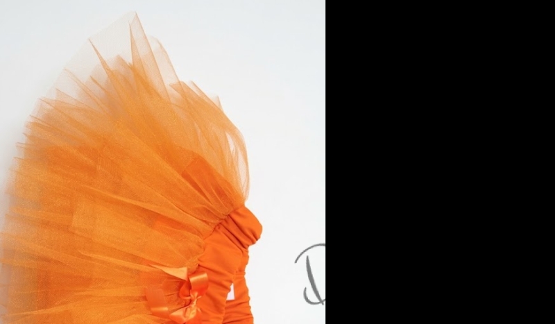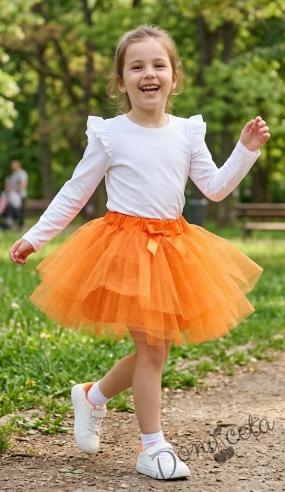 Весел комплект от поличка тип пачка в оранжев цвят от тюл с блузка с дълъг ръкав в бяло с къдрички на рамената.