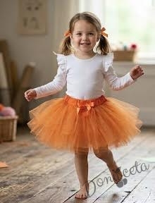 Комплект от 2 части-детска туту пола пачка в оранжев цвят блузка с дълъг ръкав в бяло с къдрички на рамената