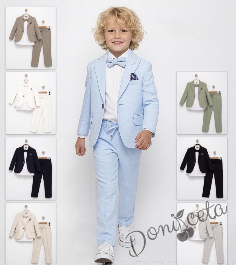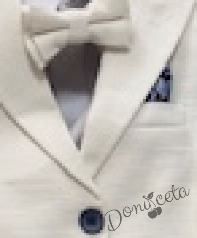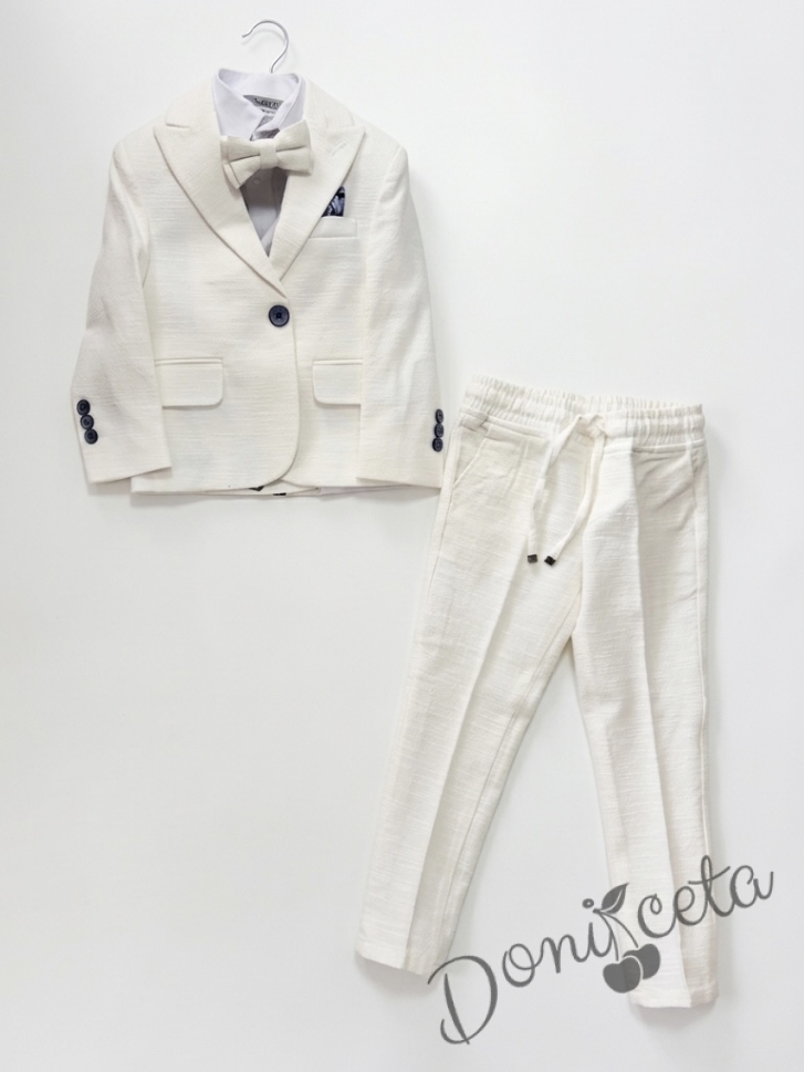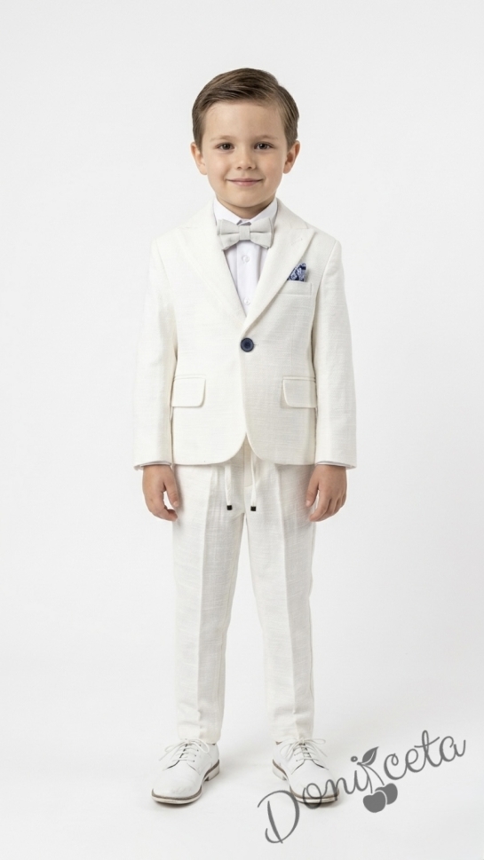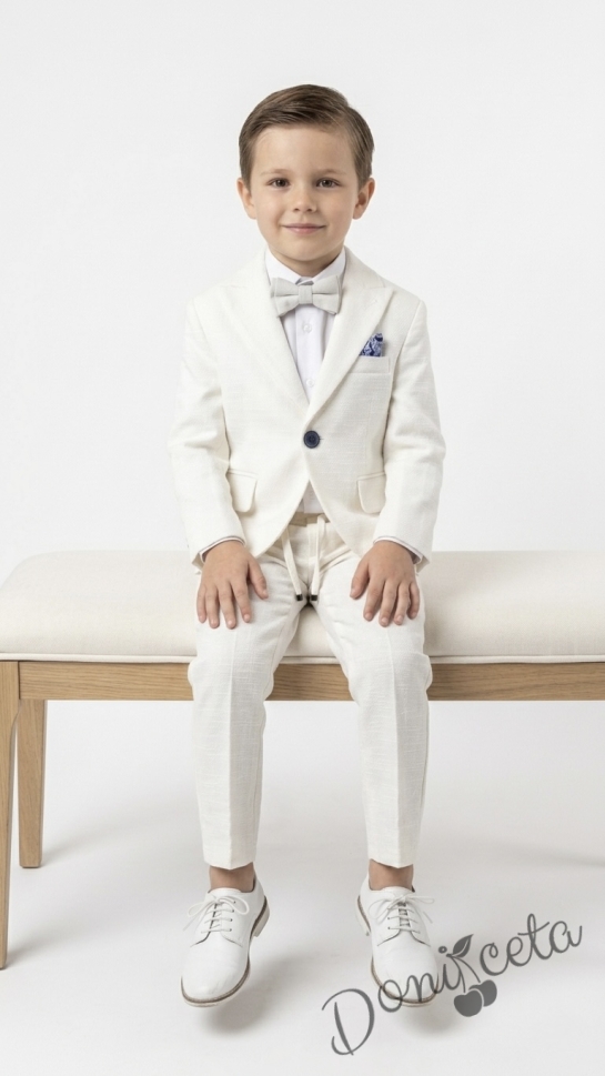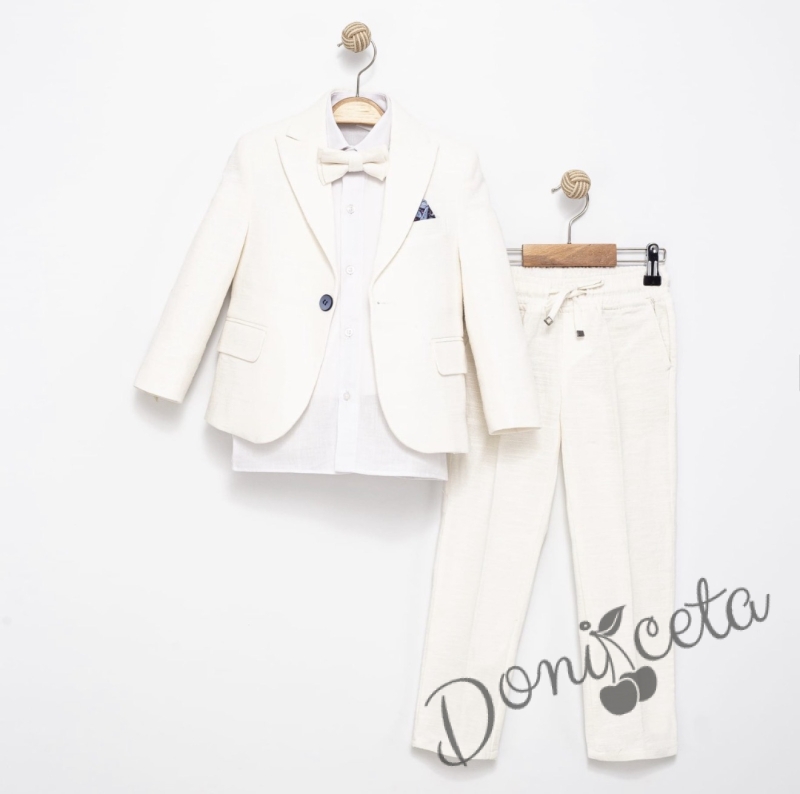 Спортно-елегантен комплект Тери за момче от 4 части в екрю - риза в бяло, сако с джобове, панталон с връзки и папийонка