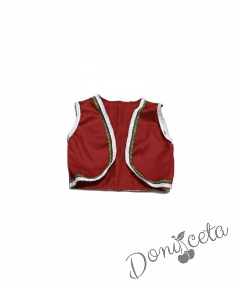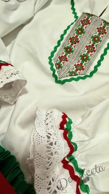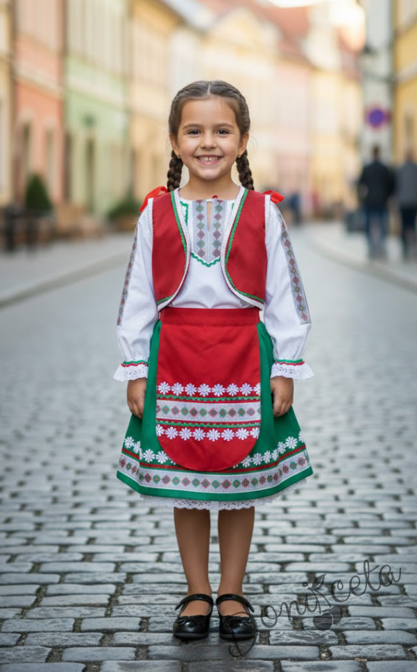 Детска народна носия трибагреник- риза в бяло, пола в зелено, елек в червено и престилка в червено с фолклорни/етно мотиви