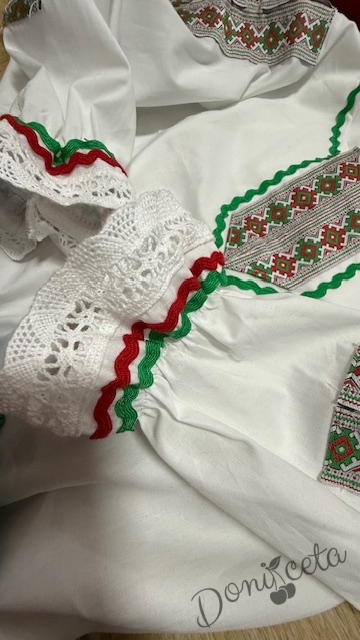 Комплект за момиче от 2 части- пола с етно мотиви и риза в бяло с червени къдрици