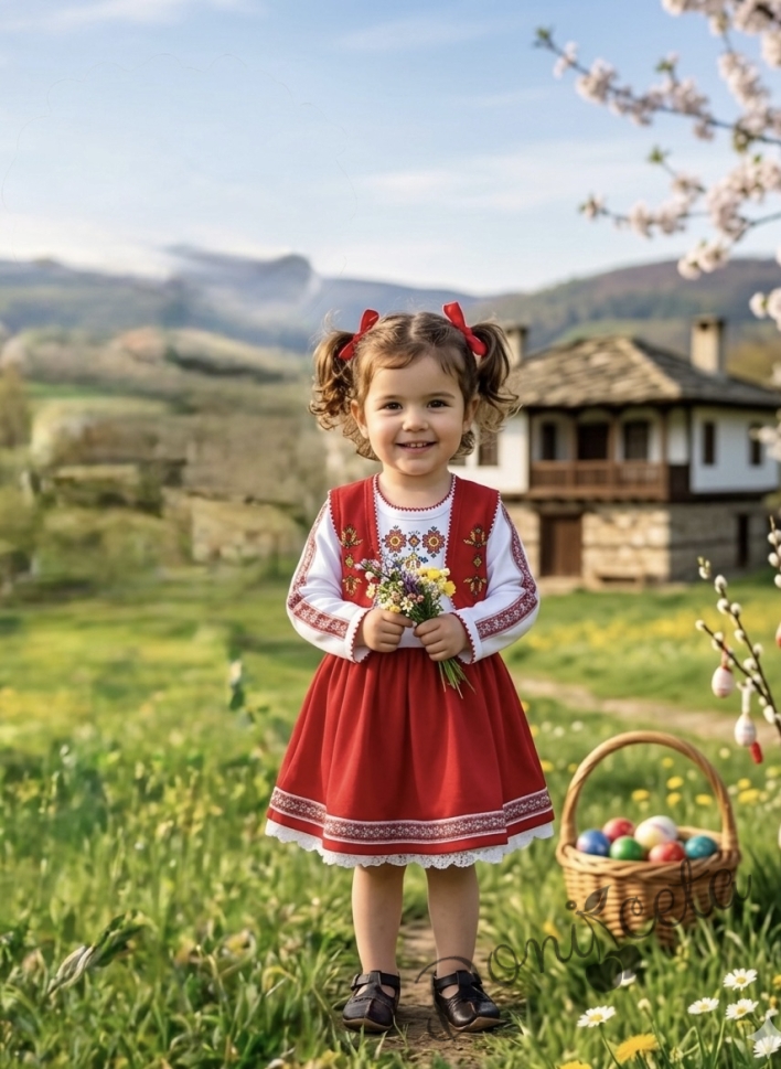 - Красива детска памучна рокля в червено с фолклорни/етно мотиви с дълъг ръкав и елек.