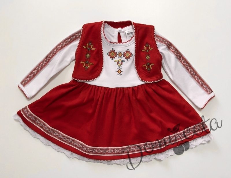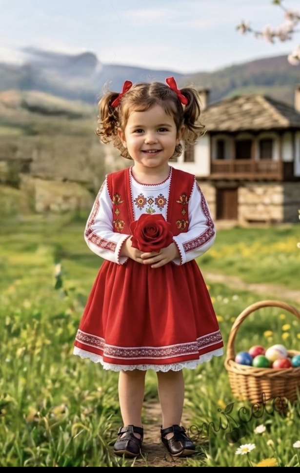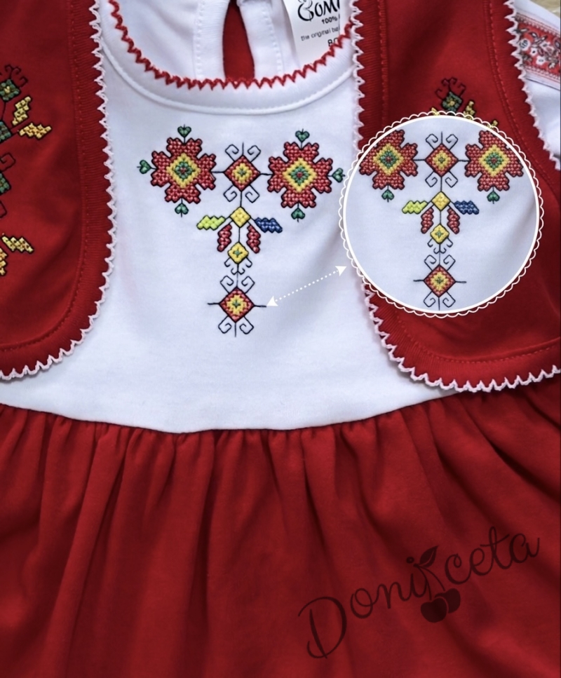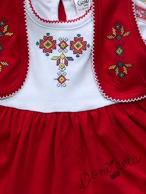 Комплект от детска рокля в червено с фолклорни етно мотиви с ръкав и елек в червено