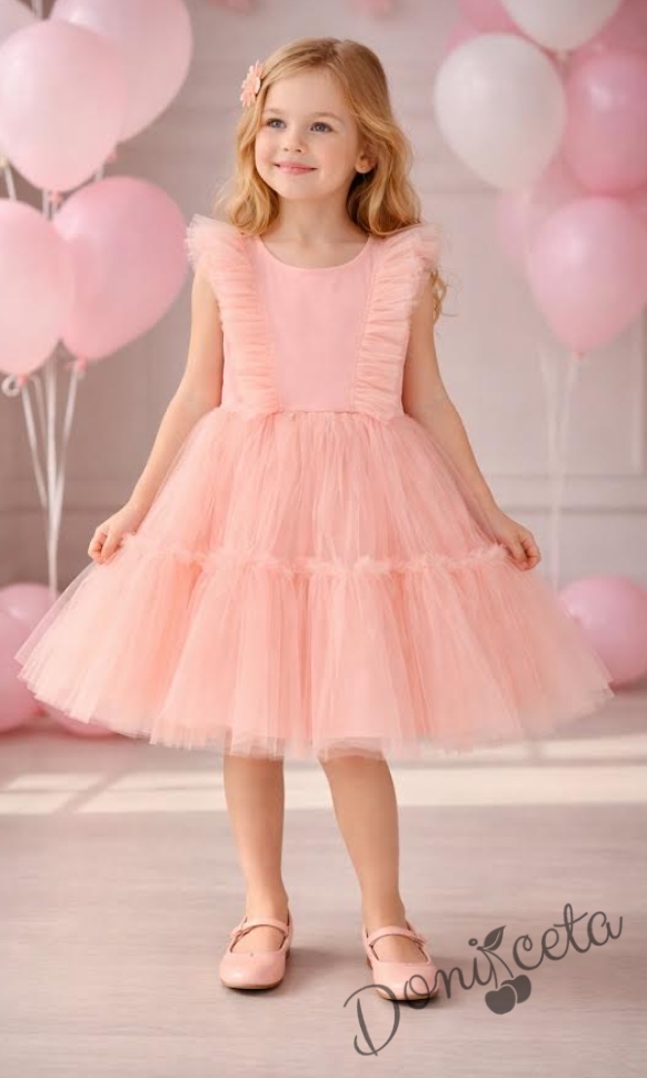 Официална или ежедневна детска рокля в прасковено с ефирен тюлен завършек