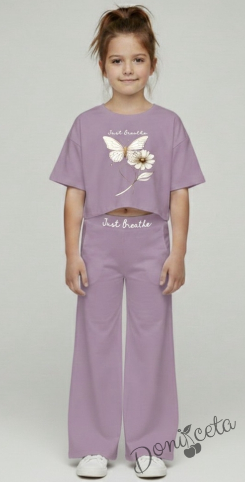 Комплект за момиче от блузка с къс ръкав в лилаво с пеперуда и панталон с широки крачоли