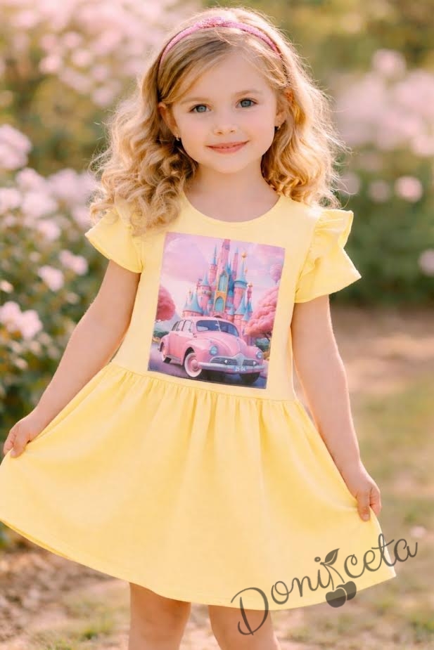 Детска ежедневна рокля с къс ръкав в жълто с щампа и къдрички на рамената