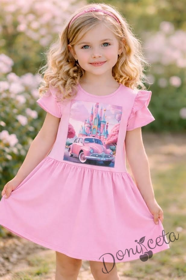 Детска ежедневна рокля с къс ръкав в розово с щампа и къдрички на рамената