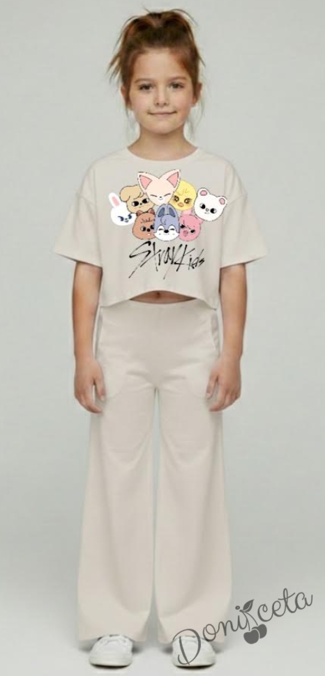 Интересен комплект за момиче от блузка с къс ръкав в екрю с герои и панталон с широки крачоли