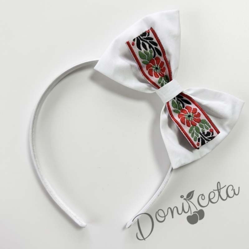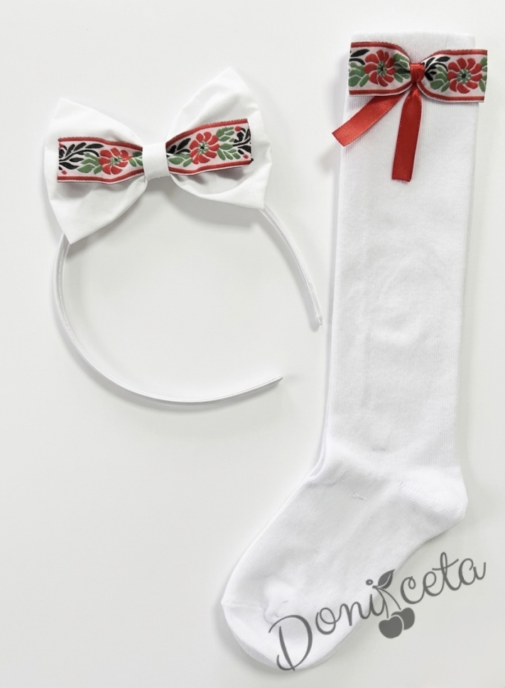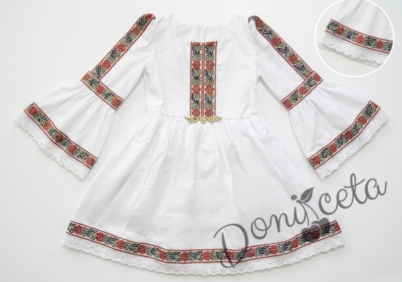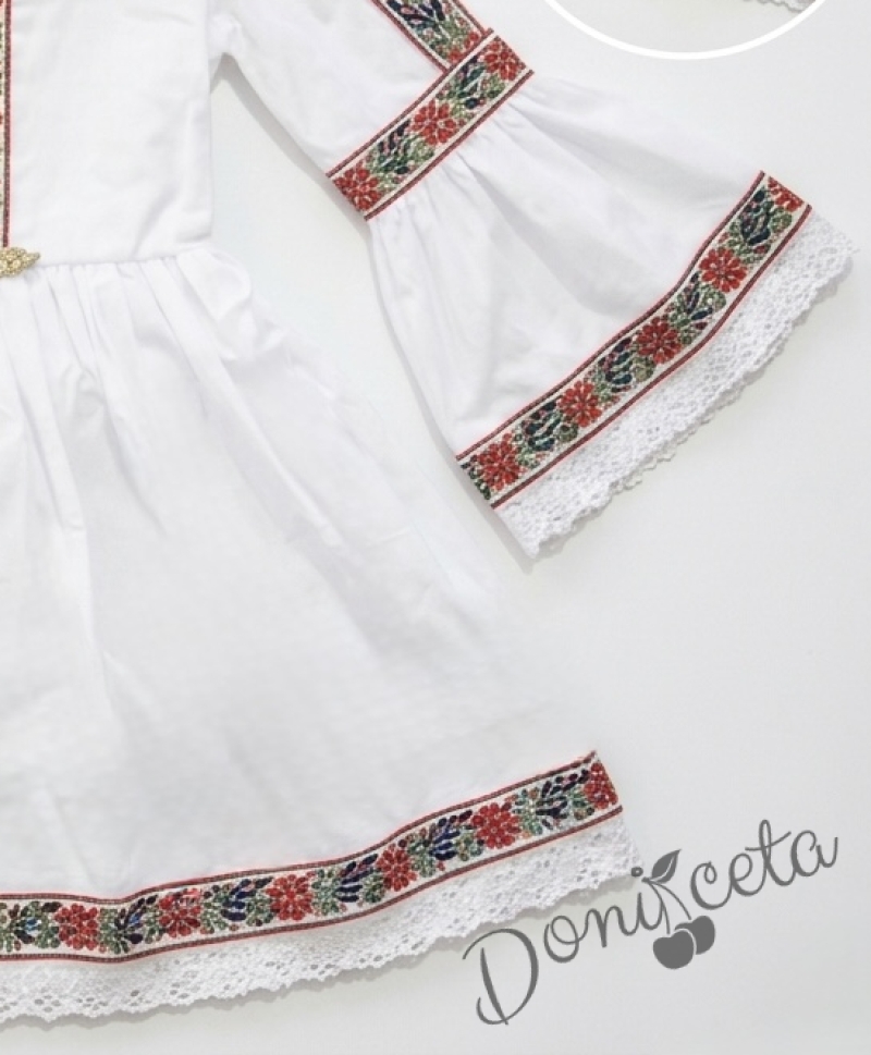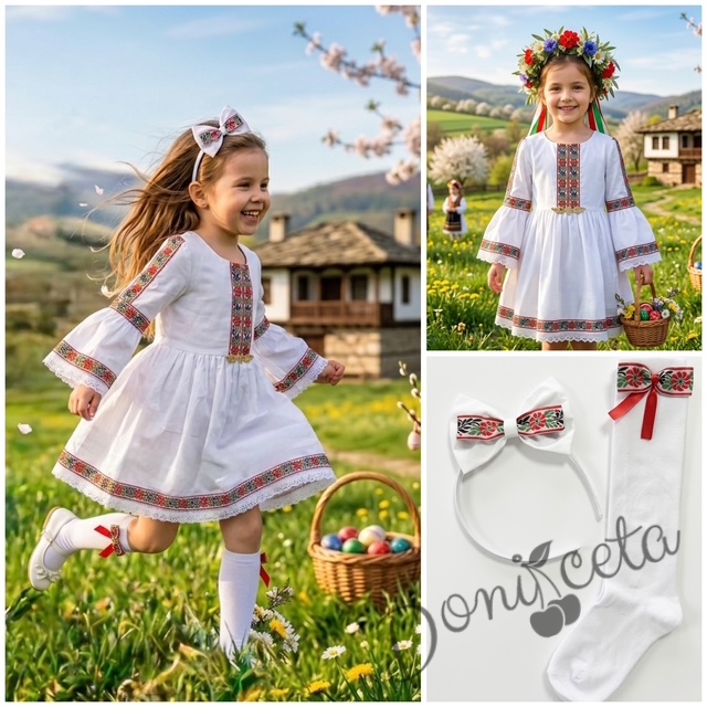 Комплект от детска етно рокля Ели тип носия с ръкав до лакътя в бяло с шевица с фолклорни мотиви , чорапки и диадема