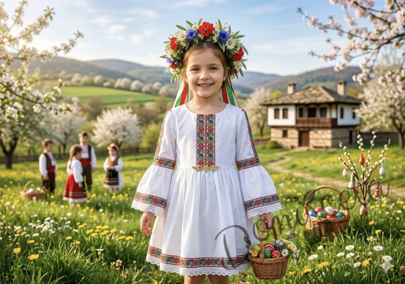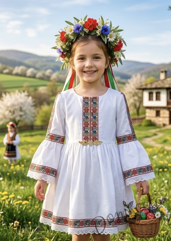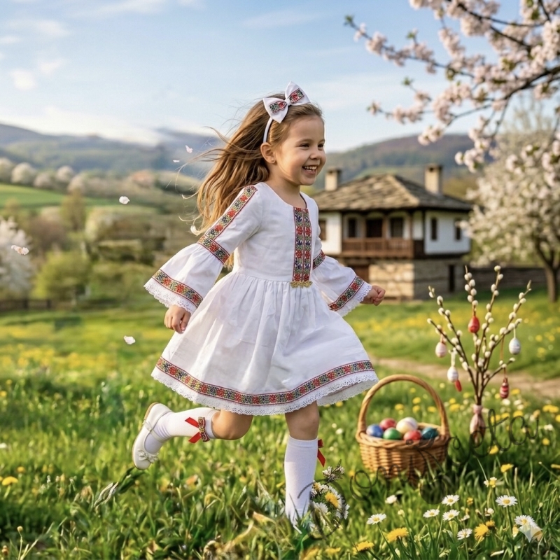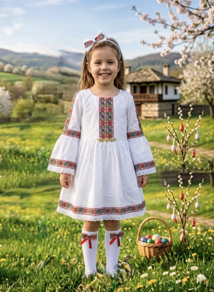 Представяме ви очарователната детска етно рокля в нежно бяло, украсена с изящна шевица и традиционни фолклорни мотиви. Тази рокля е перфектният избор за малките принцеси, които обичат да се чувстват специални и да носят дрехи с история и душа.
