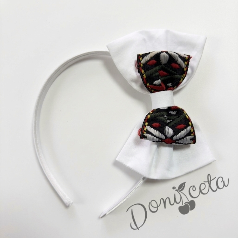 Детска рокля в червено с фолклорни/етно мотиви тип народна носия и диадема в бяло