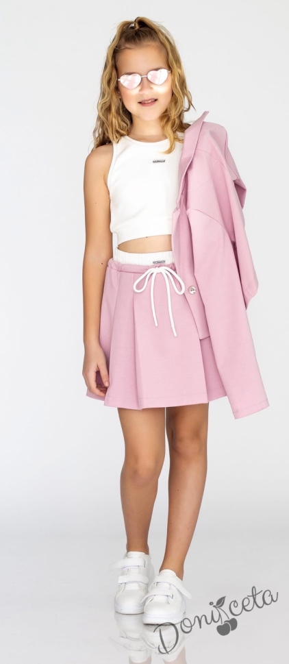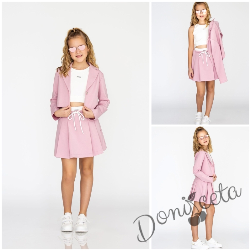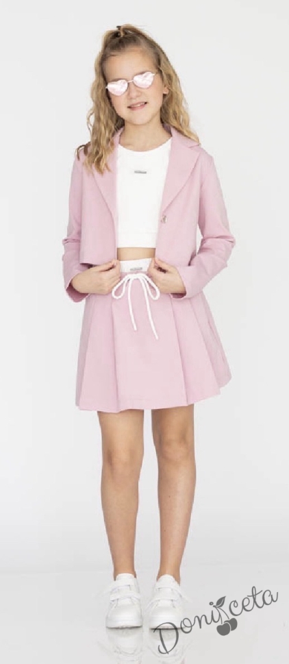 Комплект за момиче от 3 части-пола , бюстие и късо сако с дълъг ръкав в розово
