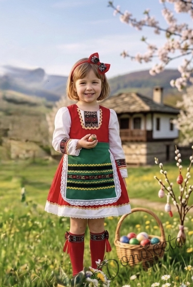 Начало БАБА МАРТА Детска етно рокля с дълъг ръкав в червено с фолклорни/етно мотиви тип народна носия с престилка в зелено