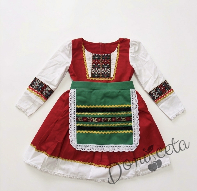 Детска етно рокля с дълъг ръкав в червено с фолклорни/етно мотиви тип народна носия с престилка в зелено