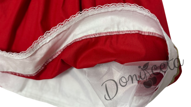 Роклята е изработена с внимание към детайла, като съчетава класическия червен цвят с бели ръкави и фолклорни мотиви.