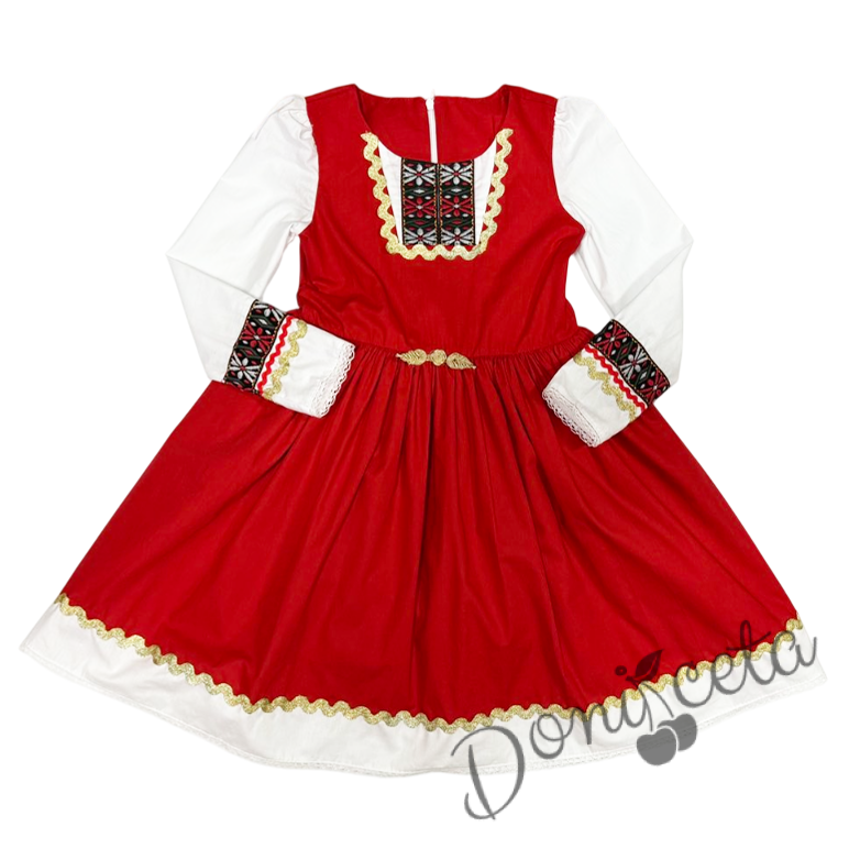 Роклята е изработена с внимание към детайла, като съчетава класическия червен цвят с бели ръкави и фолклорни мотиви.