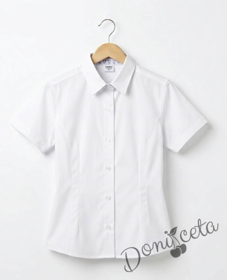 Блузата с къс ръкав е в класически бял цвят и е украсена с къдрички, които добавят допълнителна доза сладост и елегантност. Тя е удобна и практична, идеална за топлите дни. Съчетана с полата, блузата създава завършен и стилен вид, подходящ както за училище, така и за специални събития.