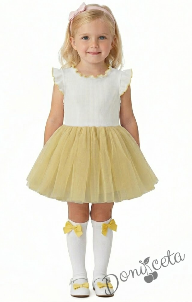 Представяме ви нашата очарователна детска рокля без ръкав, перфектна комбинация от комфорт и елегантност. Тази красива рокля е в нежен цвят екрю, комбиниран с ефирен тюл в жълто, което я прави идеална за всяко специално събитие или просто за една красива разходка.