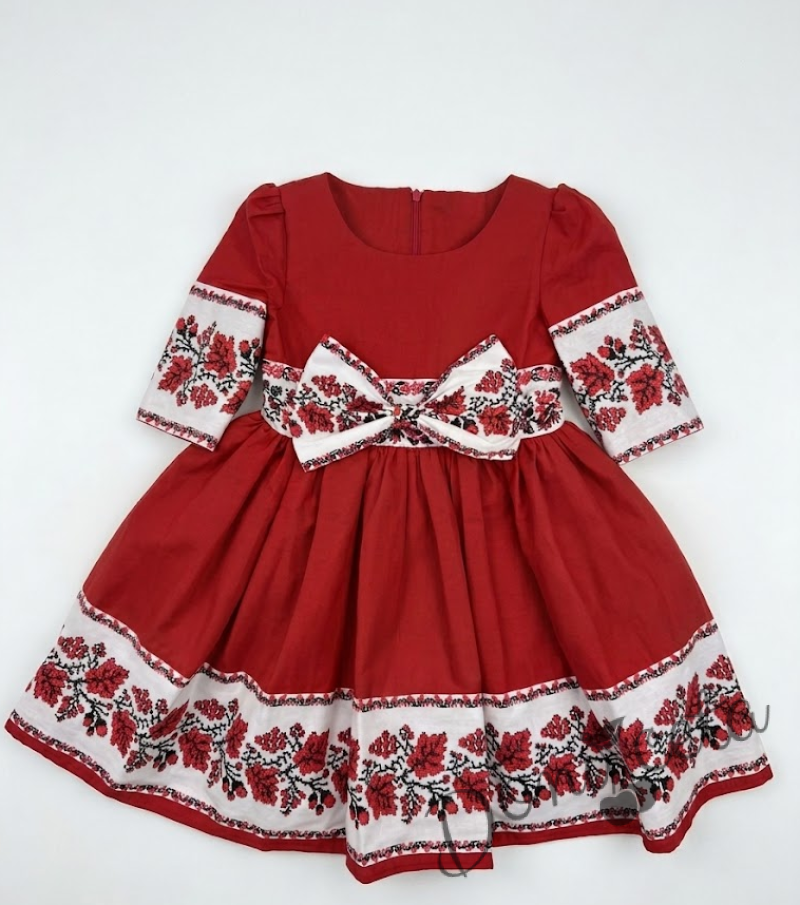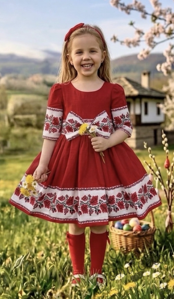 Детска етно рокля Боряна в червено тип носия с ръкав до лакътя с коланче с панделка в бяло с шевица и фолклорни мотиви