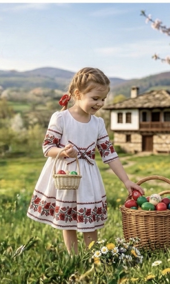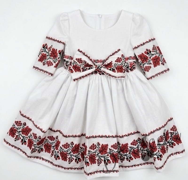 Детска етно рокля Боряна в бяло тип носия с ръкав до лакътя с коланче с панделка в бяло с шевица и фолклорни мотиви