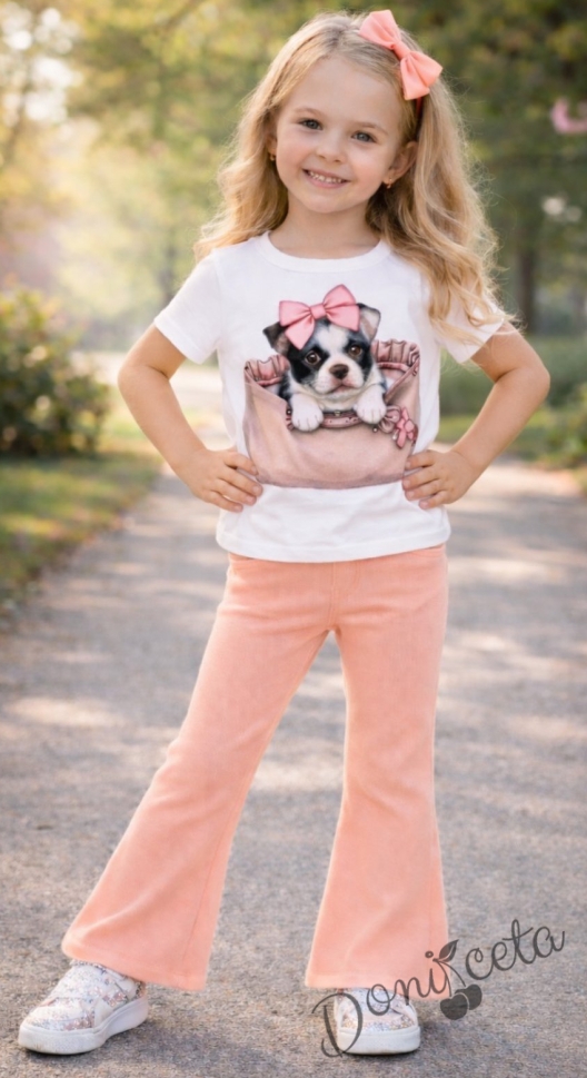 Комплект за момиче от бяла тениска с куче и разкроен панталон в прасковен цвят