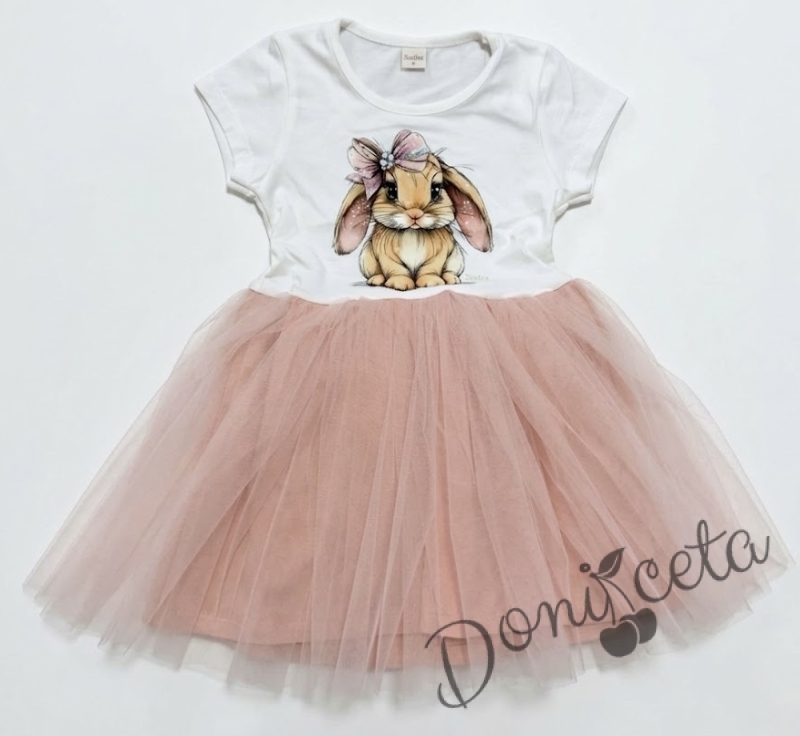Бебешка или детска рокля с къс ръкав в прасковено със зайче