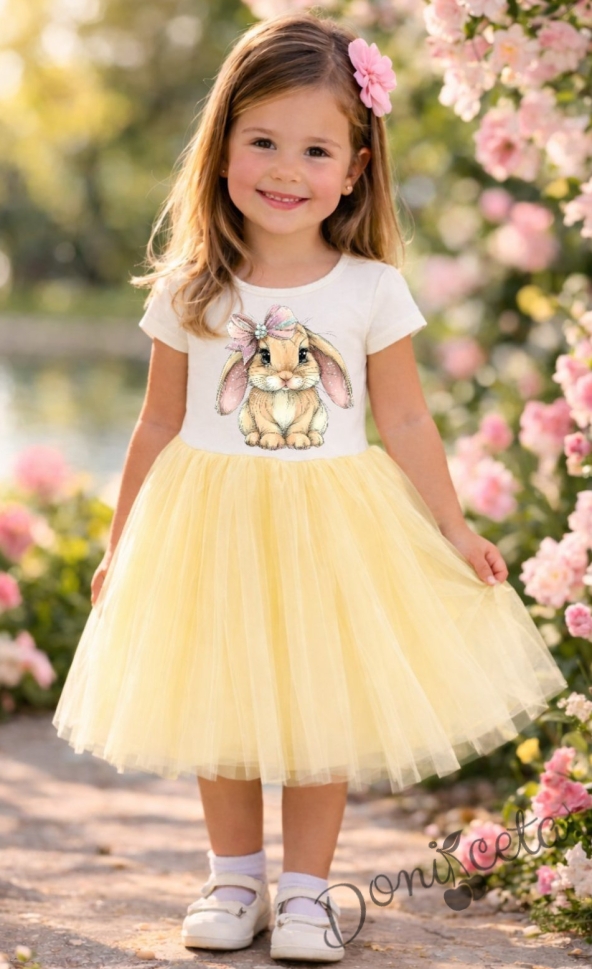 Класическа, пролетно-лятна рокля за бебета и деца със сладко зайче. Роклята е с мека материя, идеална за всеки ден или празник.