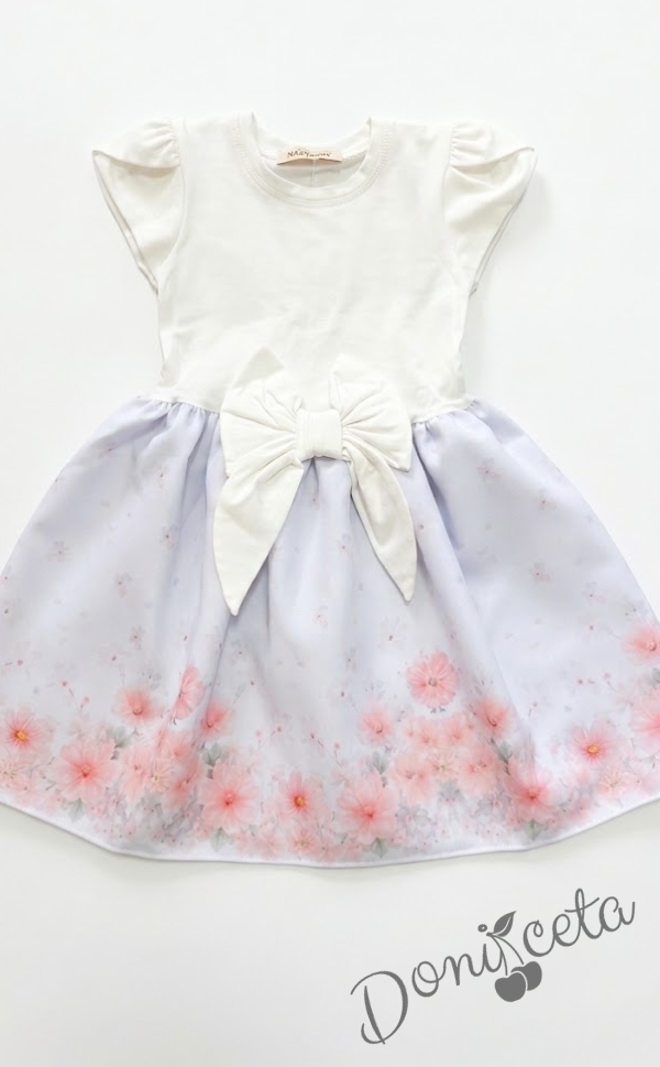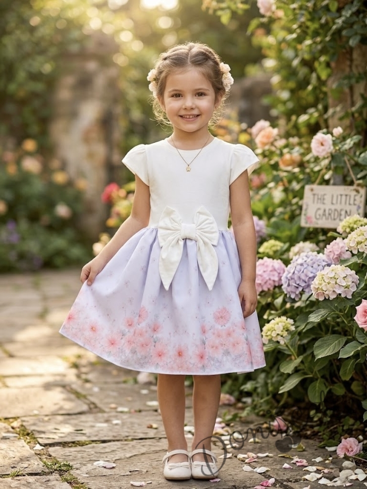 Детска ежедневна рокля в екрю и нежно лилав цвят с флорални мотиви