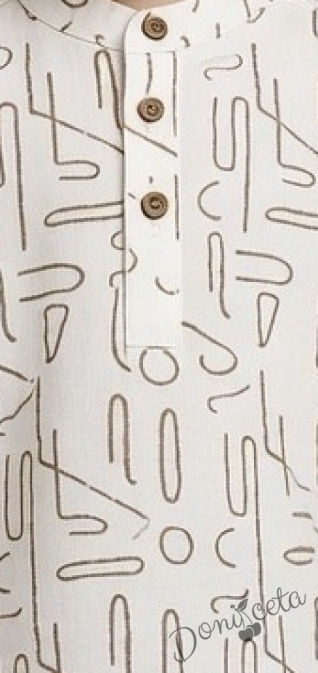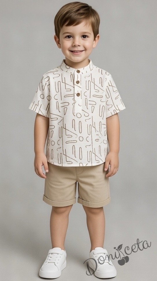 Комплект за момче от ризка в бяло с орнаменти и бежови къси панталони