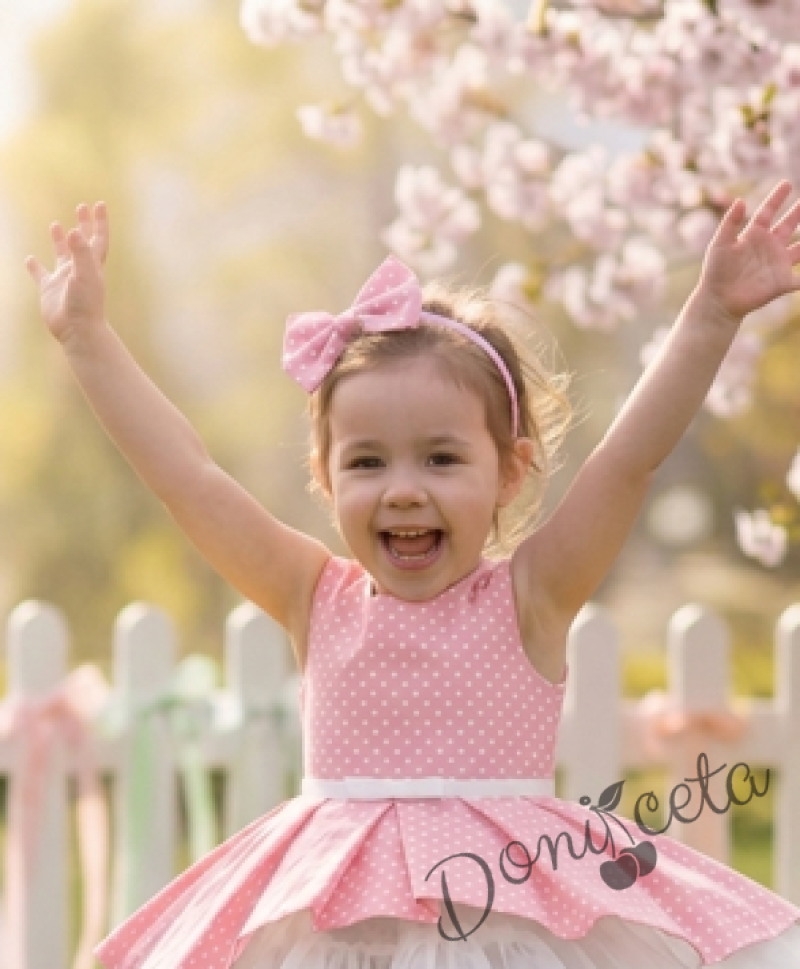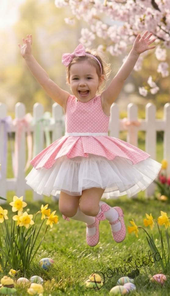 Детска памучна рокля Надежда в прасковено на точки с тюл в бяло