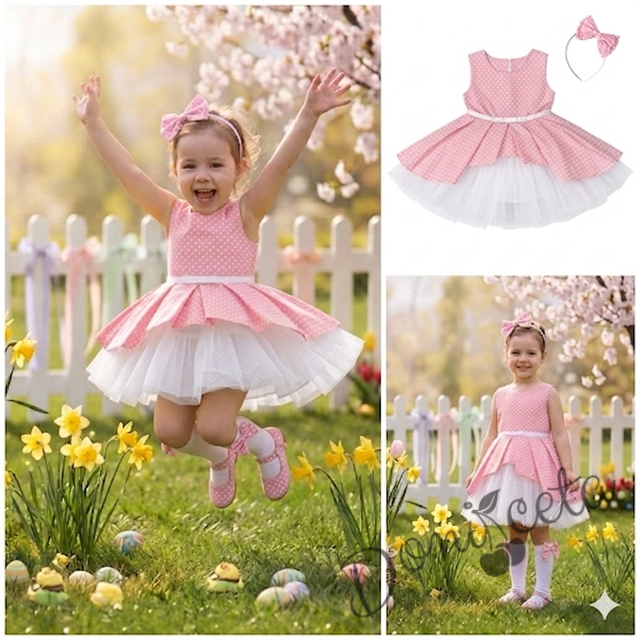 - Много красива детска официална рокля в прасковено с богат тюл в бяло на точки с диадема и чорапки.