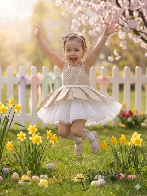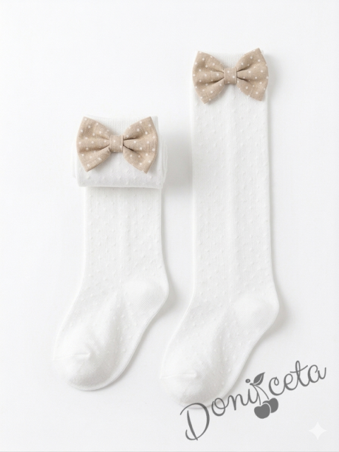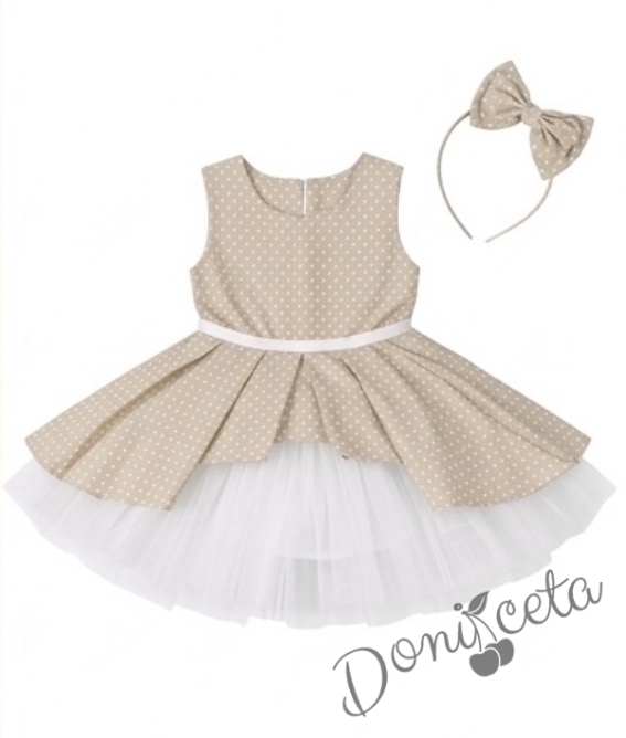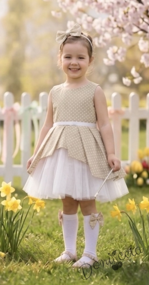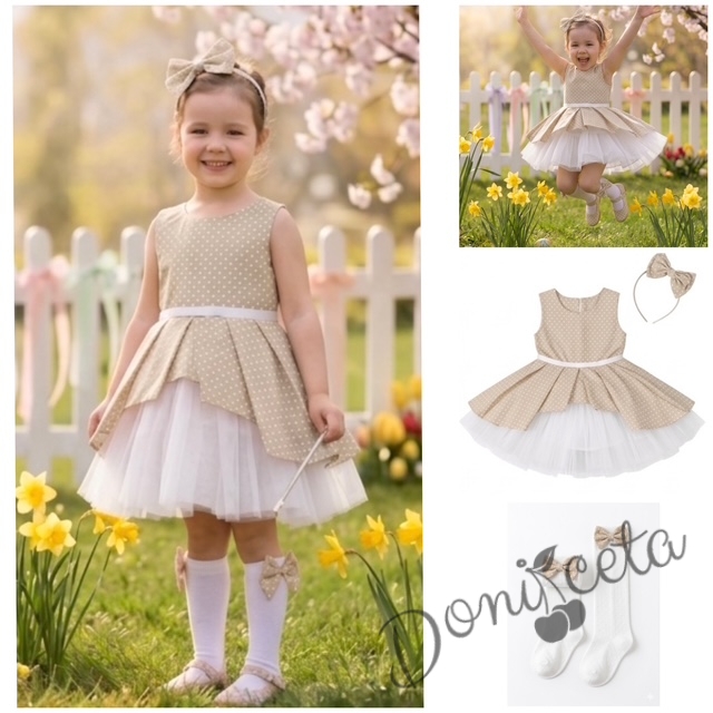 - Много красива детска официална рокля в бежово с богат тюл в бяло на точки с диадема и чорапки.
