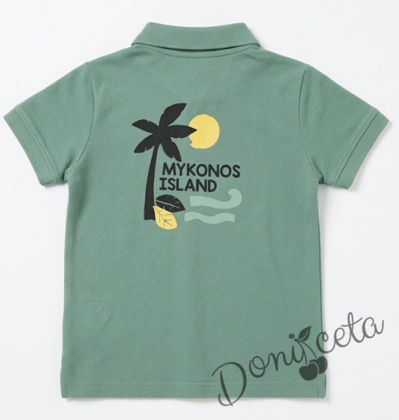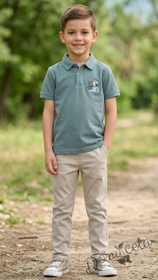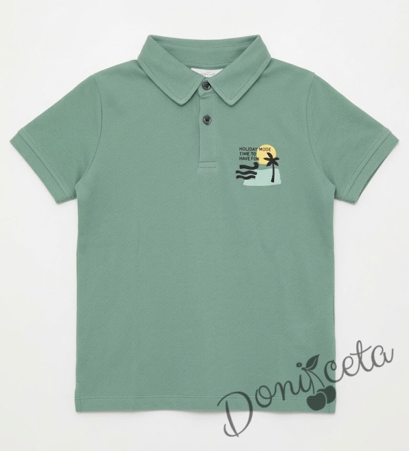 Детска блуза за момче с къс ръкав и яка в масленозелено с щампа