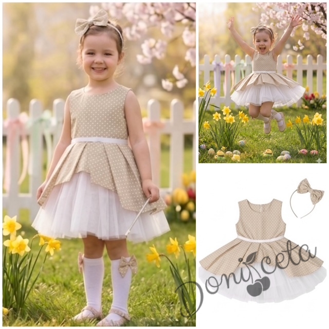 Комплект от 2 части- детска памучна рокля Надежда в бежово на точки с тюл, диадема за коса в синьо