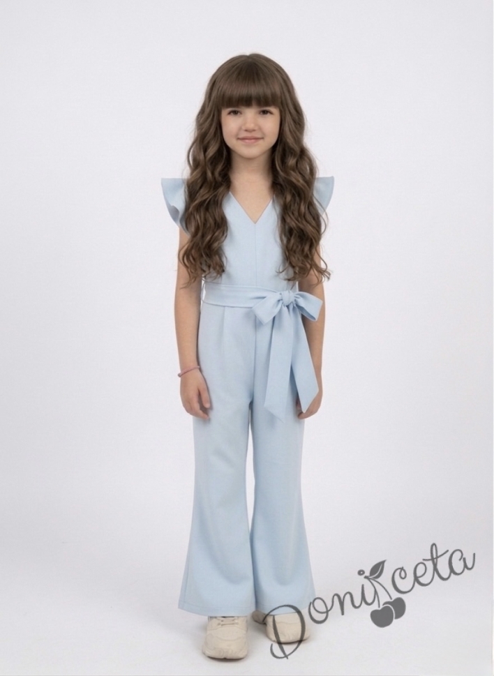 Елегантен детски дълъг гащеризон за момиче в светлосиньо с къдрички