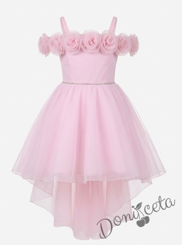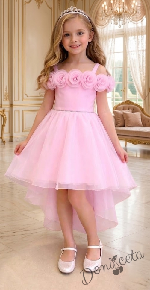 Официална детска рокля Вяра с деколте декорирано с обемни 3D рози в розово