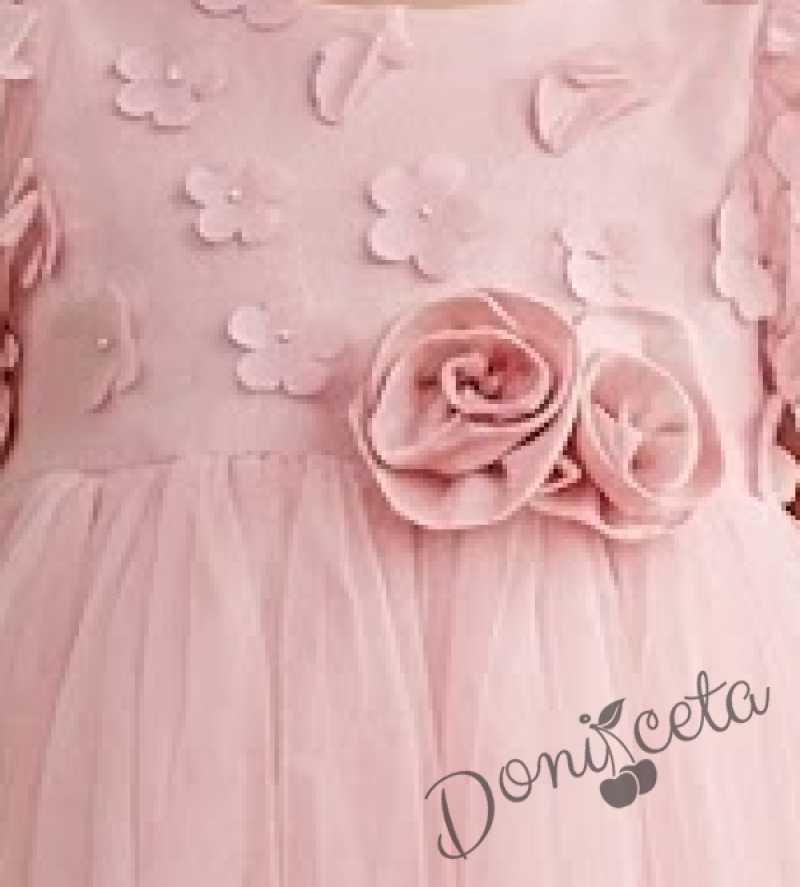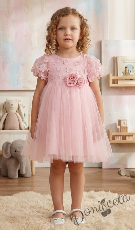 Нежна детска рокля с цветя и тюл в розово
