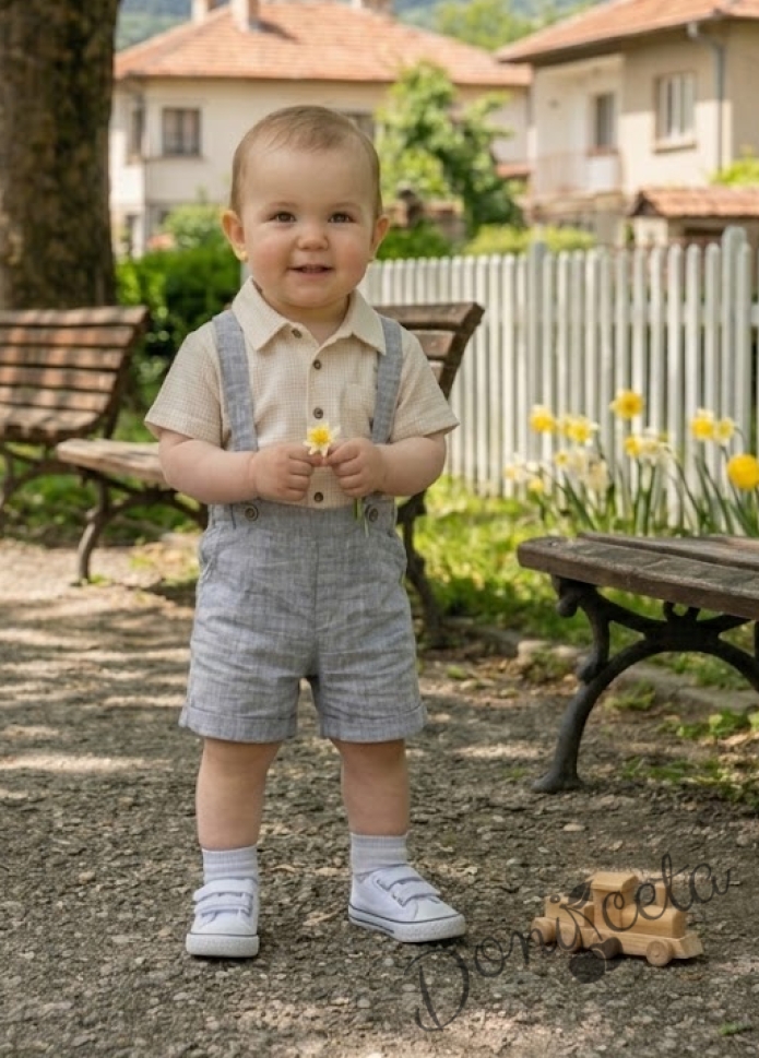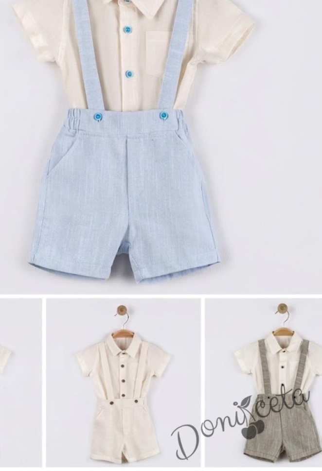 Комплект за момче от къси панталонки тип гащеризон с светлосиньо и ризка с къс ръкав в екрю