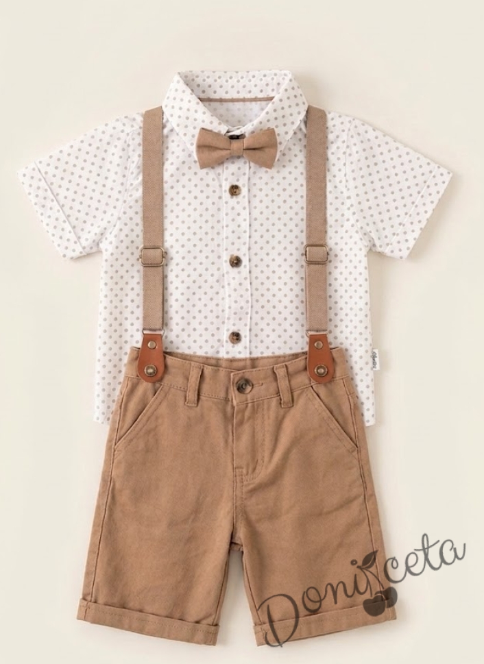 Комплект за момче от 4 части - риза в бяло с бежови орнаменти с къс ръкав, къси панталони, папийонка и тиранти в бежово