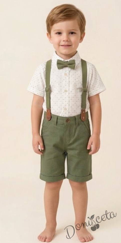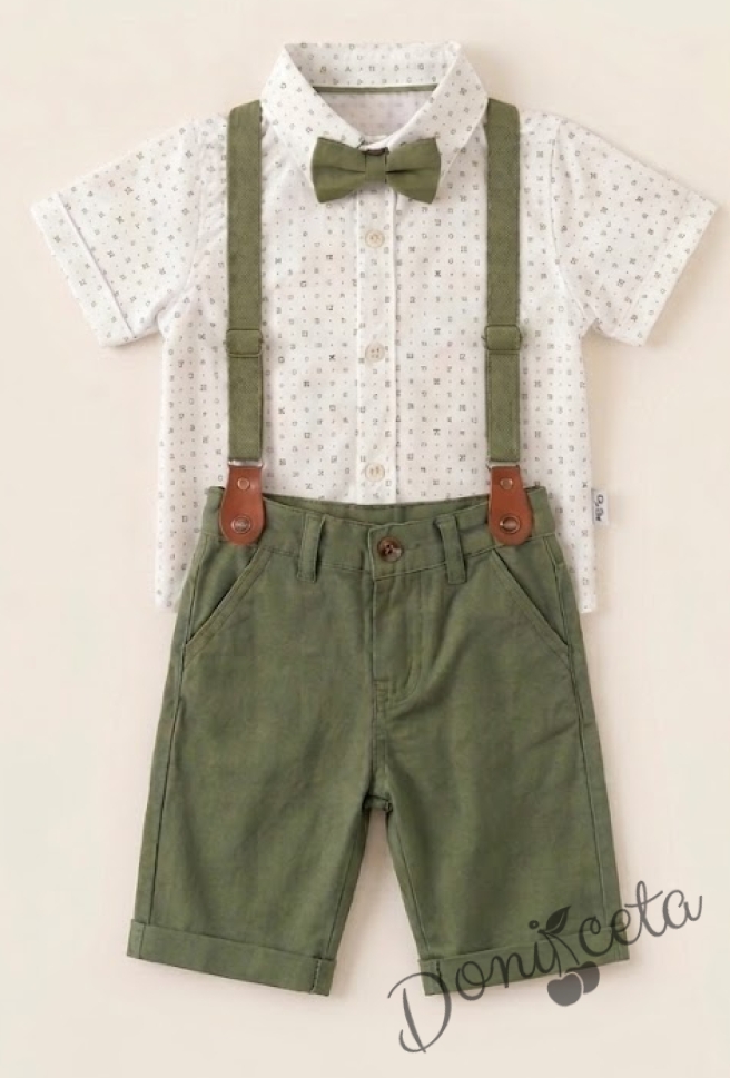 - Комплект за момче от 4 части - риза в бяло с зелени орнаменти с къс ръкав, къси панталони, папийонка и тиранти в зелено.