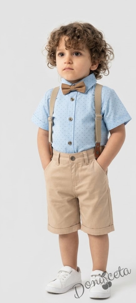 Комплект за момче от 4 части - риза в светлосин цвят с бежови орнаменти с къс ръкав, къси панталони, папийонка и тиранти в бежово
