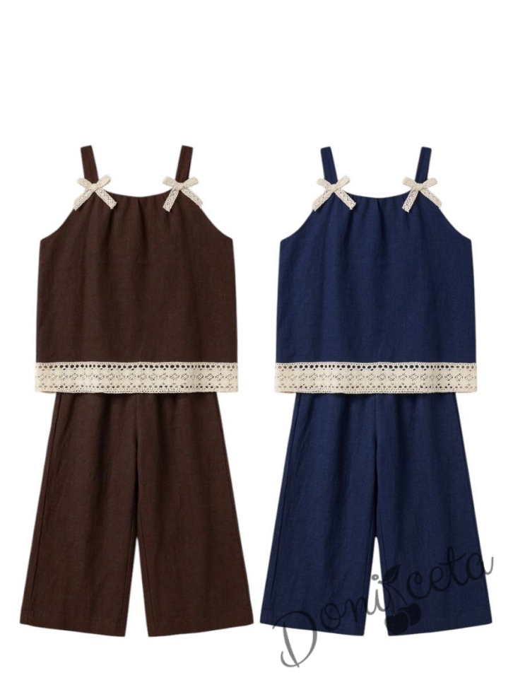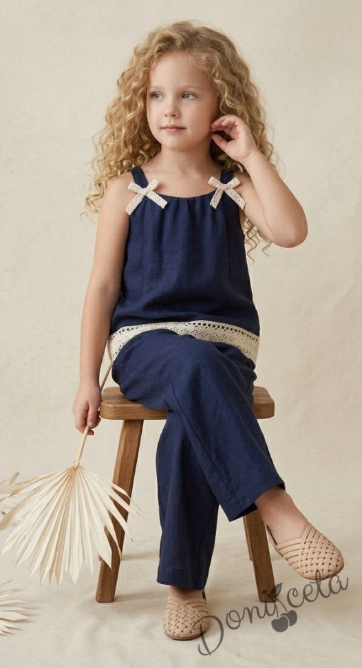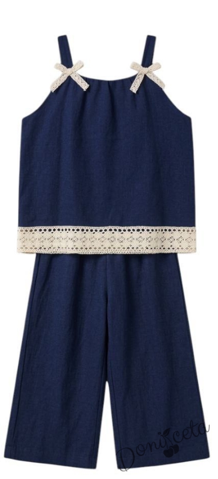 Комплект за момиче от топ и разкроен панталон в синьо