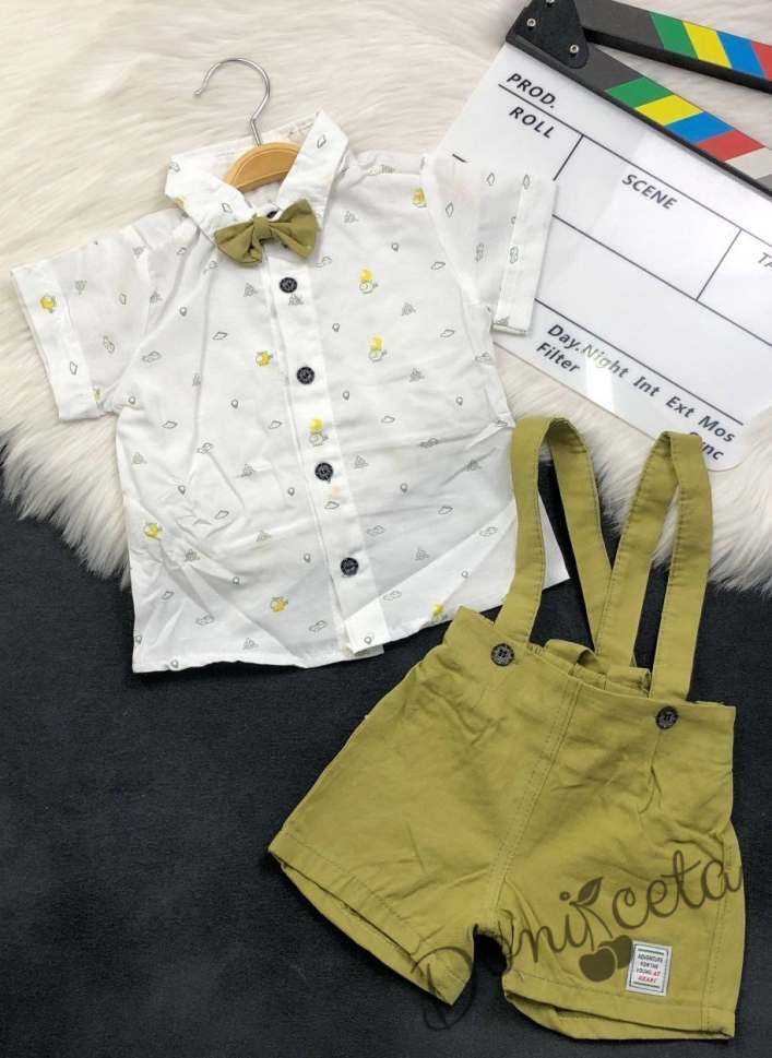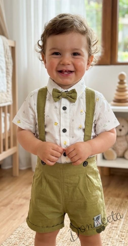 Комплект за момче от 3 части - риза в бяло с орнаменти с къс ръкав, къси панталони тип гащеризон и папийонка в маслинено зелено