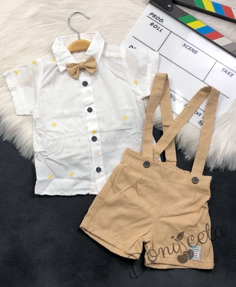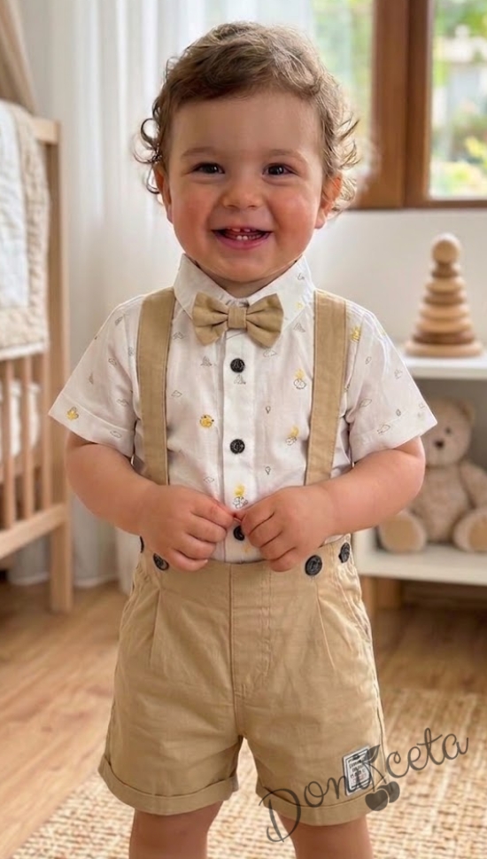 Комплект за момче от 3 части - риза в бяло с цветни орнаменти с къс ръкав, къси панталони тип гащеризон и папийонка в бежово